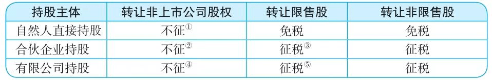 (2)套现免征增值税。通过有限合伙企业、有限公司套现均需缴纳增值税。不同持股模式下增值税税率表,如图。