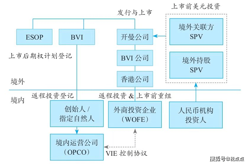 (1)股权控制模式:股权控制架构先由境内公司的创始股东在英属维京群岛(以下简称“BVI”)、开曼群岛等地设立离岸公司,然后利用离岸公司通过种种方式收购境内权益,最后以该离岸公司为融资平台发售优先股或者可转股贷款给基金进行私募融资,最终实现该离岸公司境外上市目的。