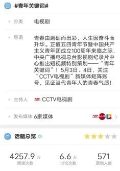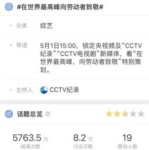 数据显现,“在国际最高峰,向劳动者问候”特别策划直播观看人次,在央视频当日移动直播排行榜中名列第一,到5月6日,微博同名话题词#在国际最高峰向劳动者问候#阅览量超5750万;“青年关键词”短视频特别策划在全矩阵内容平台中收成超2697.7万次播映,#青年关键词#登上微博热搜,总阅览量超越4250万。